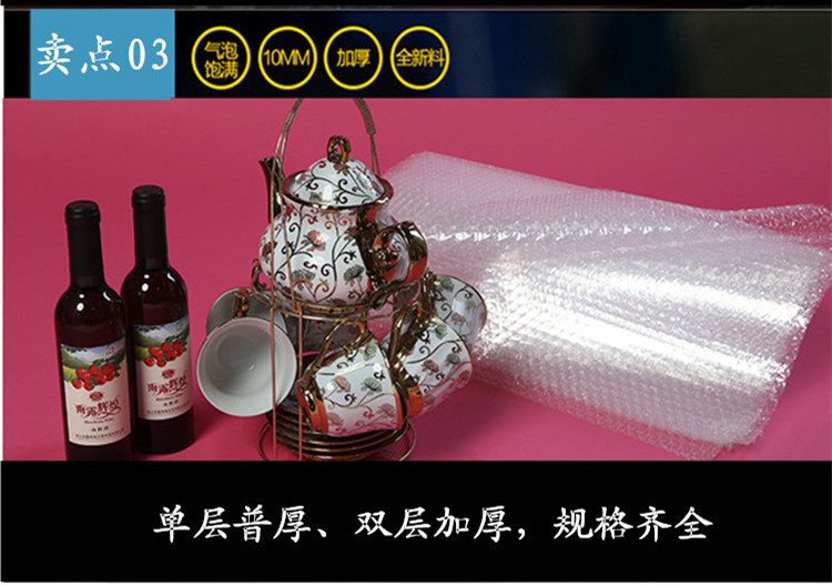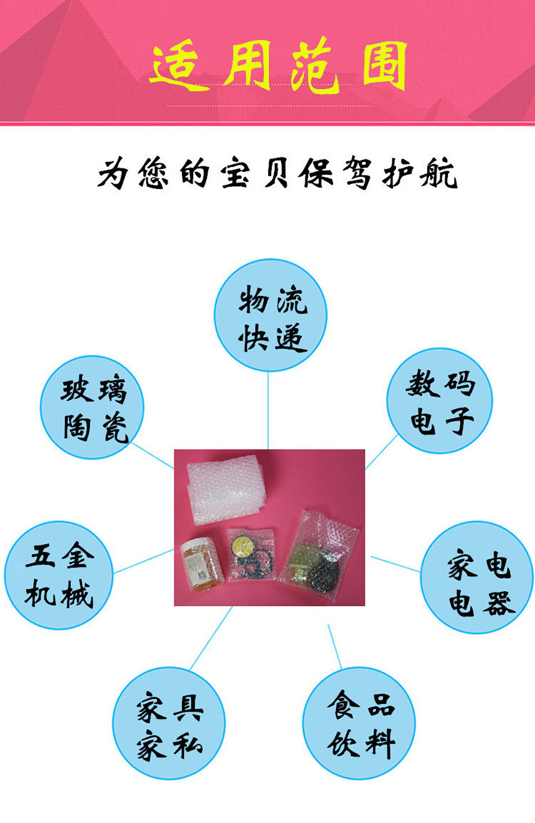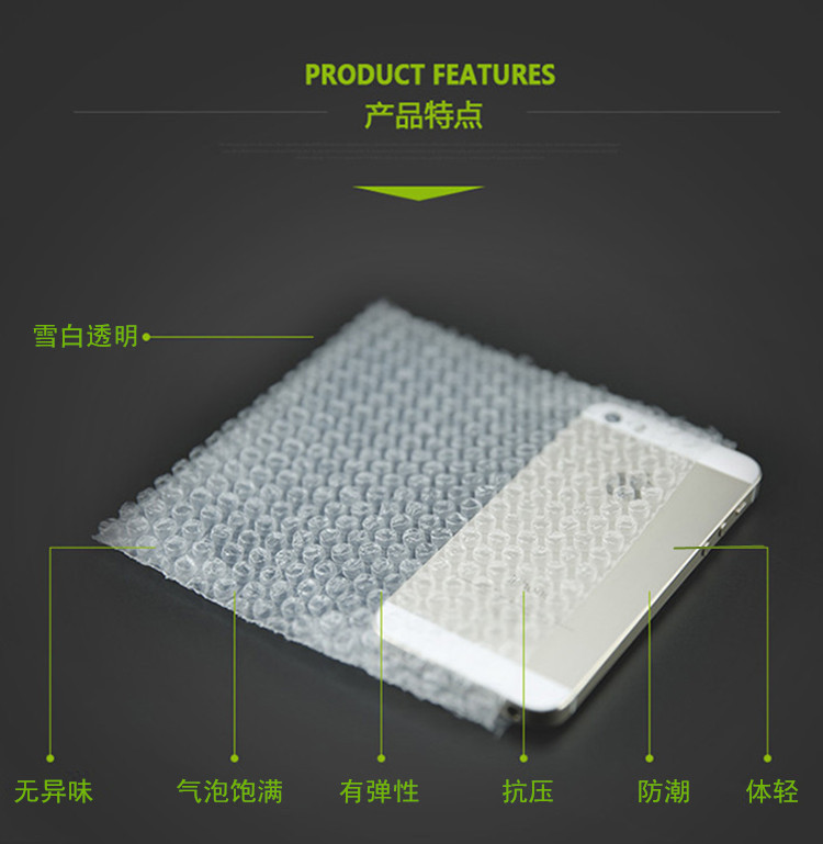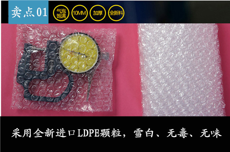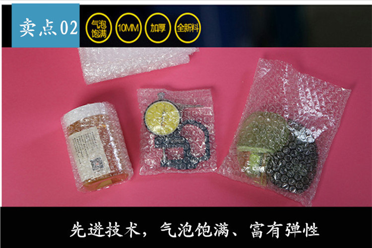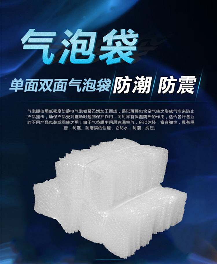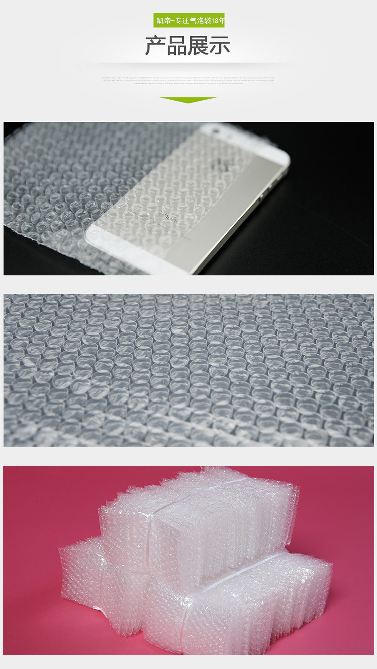 凱帝氣泡袋,氣泡膜經(jīng)制袋機(jī)制袋焊制而成。具有良好的減震性、抗沖擊性、熱合性、無(wú)毒、無(wú)味、防潮、耐腐蝕、透明度好等優(yōu)點(diǎn)。廣泛用于汽車(chē)零部件、電子電器、玻璃陶瓷、物流快遞、電子商務(wù)、食品飲料等行業(yè)的抗震性緩沖包裝。