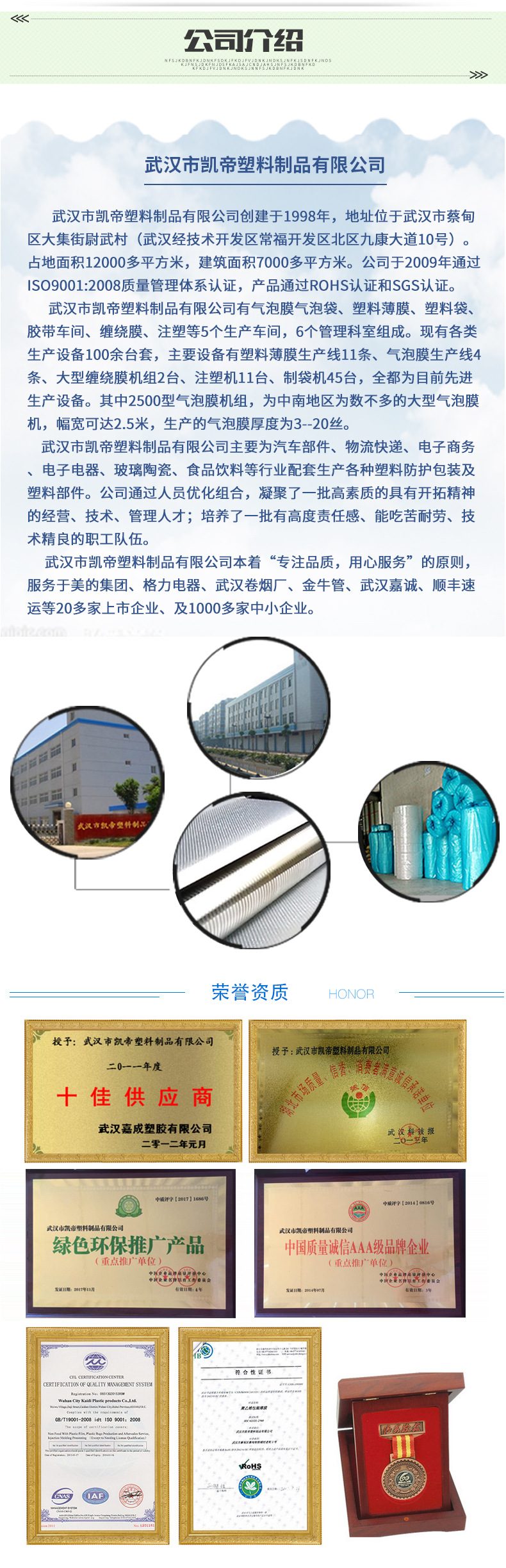 - 雙層大泡加厚氣泡膜,泡泡直徑20mm以上,泡高達6mm,泡泡內含有更多空氣,防震效果更好。我公司引進先進雙層大泡氣泡膜機組,生產(chǎn)的三層大泡加厚氣泡膜,廣泛用于電子商務、物流快遞、汽車零部件、電子電器、玻璃陶瓷、家具家私、食品飲料等行業(yè)的抗震性緩沖包裝。